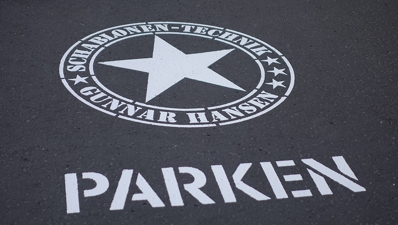 Mit Schablonen Logos auf Bodenflächen aufbringen. Werbung und Orientierung