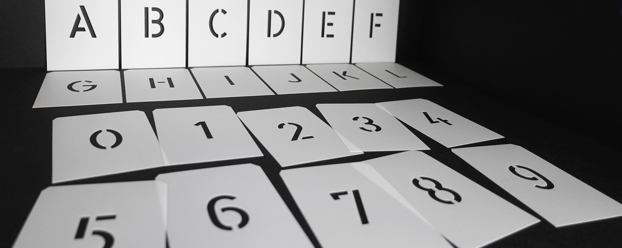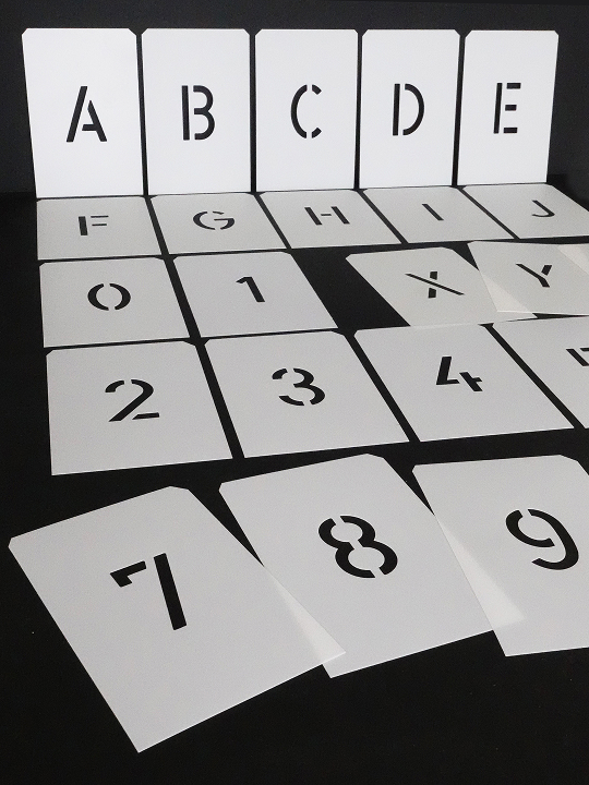Schablonen aus flexiblem Kunststoff. Erhältlich in den Materialstärken 0,3 mm und 0,5 mm und in Schriftgrößen von 8 mm bis 600 mm.