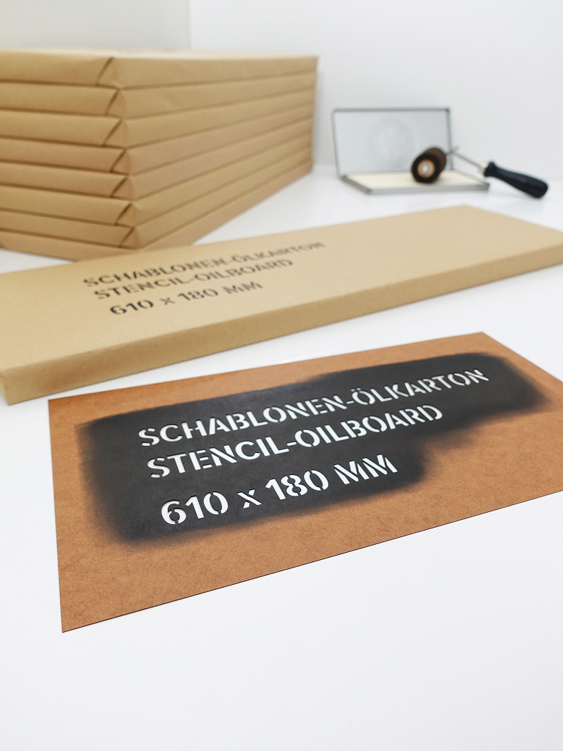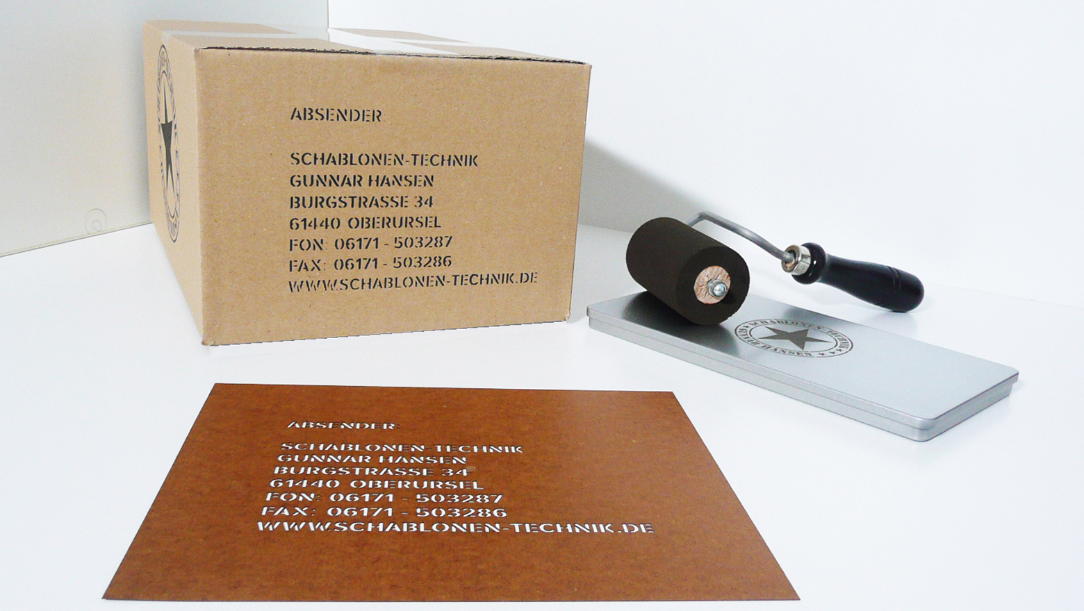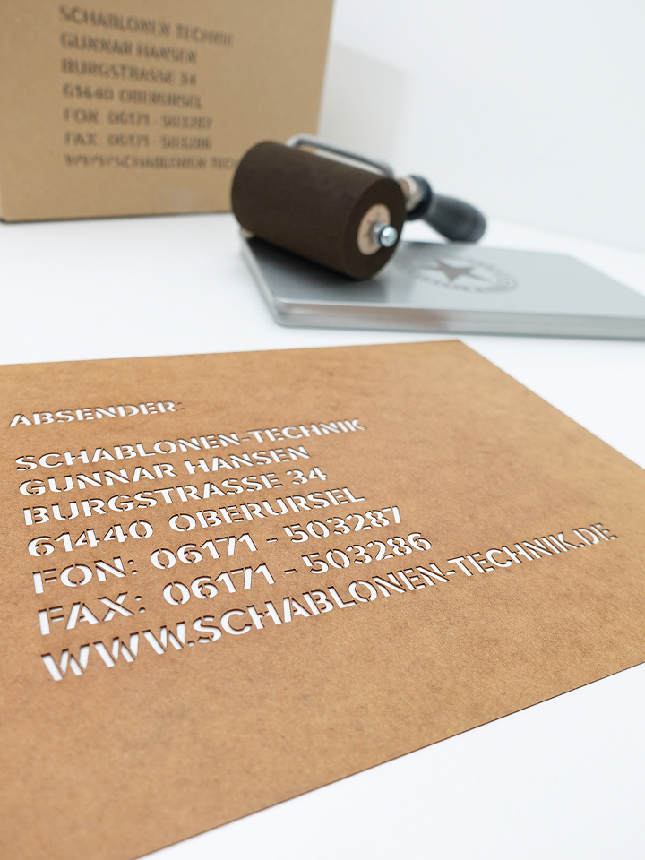 Hochwertige Textschablonen aus Ölkarton, Kunststoff oder Zinkblech. In einem Arbeitsgang feststehende Texte oder komplette Adressen signieren.