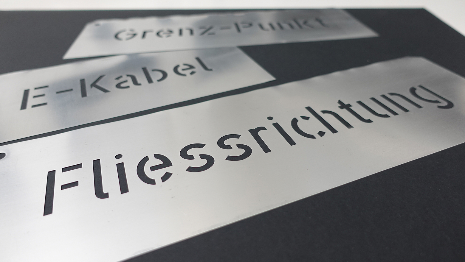 Wir fertigen Ihre Textschablonen nach Ihren Vorgaben in jeder gewünschten Schrifthöhe. Schablonen mit Ihrem Firmennamen, Adressdaten, Produktinformationen, Warnhinweisen oder für Ihre Parkplatzkennzeichnungen.