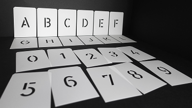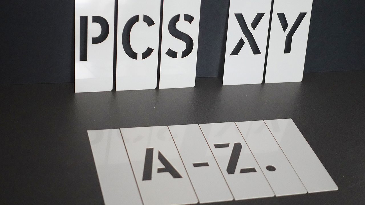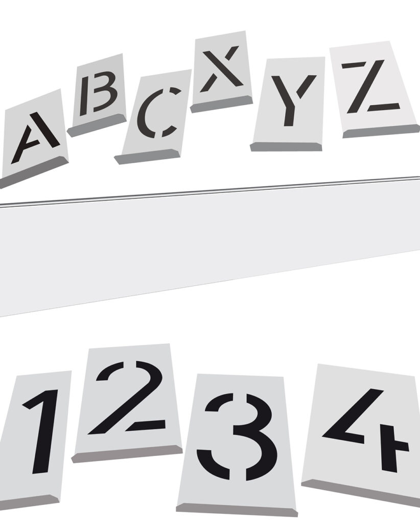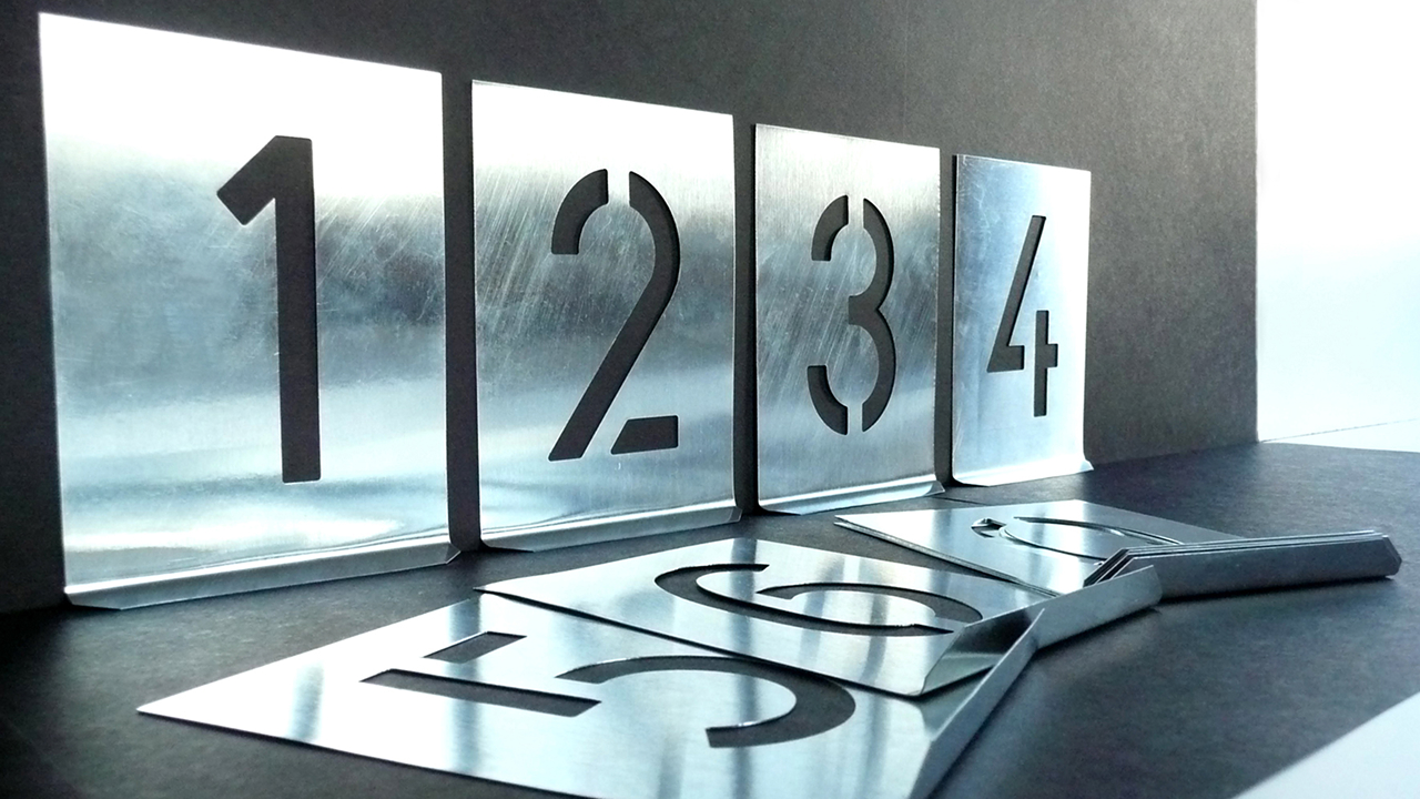 Buchstaben- und Ziffernsätze aus Zinkblech, Randbeschnitt rechts / links von 10 % der Schrifthöhe – die Klassiker, speziell für das innovative Stecksystem “Stencil-Schiene“ neu entwickelt. Bei ständig wechselnden Kennzeichnungen, erhalten Sie immer ein gutes Schriftbild durch optimales Positionieren der Ziffernschablonen und Buchstabenschablonen zueinander. So signieren Sie zügig, sauber und wirtschaftlich.